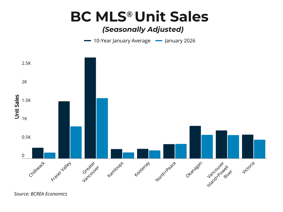 Vancouver, BC - February 11, 2026. The British Columbia Real Estate Association (BCREA) reports that 3,314 residential unit sales were recorded in Multiple Listing Service® (MLS®) Systems in January 2026, down 22.9 per cent from January 2025. The average MLS® residential pri...